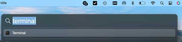 Der Mac bringt ein solches Terminal als damalig Debian-Linux basierendes Betriebssystem gleich mit. Hier genügt es mit klick auf die Lupe oben rechts das Suchfenster zu öffnen und den Begriff "Terminal" einzugeben.
